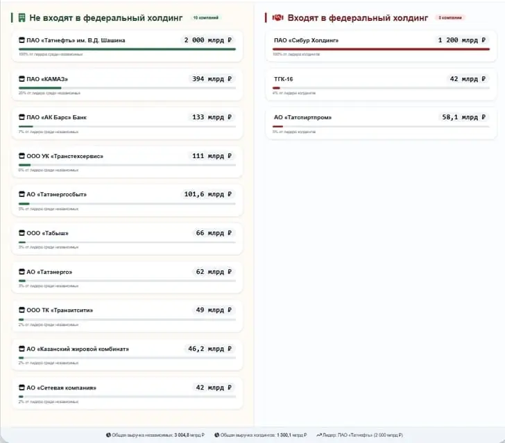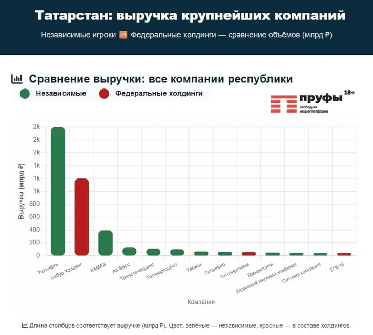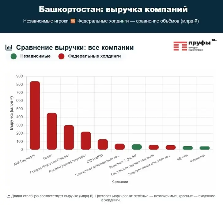 В рейтинг лидеров бизнеса России по мнению РБК вошли 500 компаний из 32 отраслей экономики, которые на октябрь 2025 года были юридически самостоятельны по отношению к другим компаниям или другим участникам рынка. Проще говоря, дочерние компании отдельно не учитываются. Вы, наверное, уже поняли: в рейтинге мы не увидели крупнейшие башкирские предприятия – ни «Башнефть», ни «Газпромнефтехим Салават», ни БСК. А что же там есть? Башкортостан представлен всего тремя компаниями: нефтегазовые «Уфаойл» (289 место), «КД-Ойл» (410 место) и «Фармленд» (434 место) из фармацевтики. Рейтинг РБК ранжируется по чистой выручке компаний – то есть выручка без НДС, акцизов и экспортных пошлин. Суммарная чистая выручка трех башкирских компаний составила 154,57 млрд рублей. Это дало Башкортостану занять 38 место в рейтинге регионов по распределению суммарной чистой выручки по итогам 2024 года. В рейтинг вошли всего 58 субъектов. Тем временем, соседний Татарстан в этом рейтинге занял почетное 6 место, уступая лишь Москве, Санкт-Петербургу, Московской области, Краснодарскому краю и Калининградской области. Суммарная выручка 16 татарских компаний, вошедших в рейтинг крупнейших, составляет 3,38 трлн рублей. Прочувствуйте разницу еще раз: 154,57 млрд и 3,38 трлн за один год. Эти цифры напрямую влияют на экономики братских республик: когда компания получает прибыль, она платит с неё налог. Большая часть налога остается там, где она зарегистрирована. Обходят Башкортостан и несколько регионов Приволжского федерального округа: Нижегородская область (606,69 млрд рублей), Самарская область (281,59 млрд), Удмуртская Республика (266 млрд), Пермский край (254,74 млрд) и Оренбургская область (245 млрд рублей). Если же сравнить с показателями соседних Челябинской и Свердловской областей, то здесь отставание не менее явное, чем с Татарстаном: 1,24 трлн и 1,65 трлн рублей соответственно. Еще одна важнейшая деталь. Все три башкирские компании из рейтинга – полностью частные. А больше половины татарских компаний из рейтинга находятся под управлением республики.Какие компании из Башкортостана вошли в рейтинг На 434 месте расположилось АО «Фармленд» с 42 млрд рублей чистой выручки за 2024 год. В 2025 году выручка компании выросла до 52,2 млрд рублей, а прибыль достигла 861,3 млн рублей. История «Фармленд» началась в конце 1997 года с небольшой аптеки в Мелеузе. Аделя Кальметьева и Олег Муров, создав компанию, хотели сделать лекарства доступными для каждого жителя региона. Так, вскоре после открытия первой аптеки, в селе Кармаскалы и Бирске появились филиалы, а в 1998 году «Фармленд» открылся в Уфе. Сейчас «Фармленд» – крупнейшая сеть в Башкортостане, входящая в десятку лидеров отрасли по России. На 410 месте рейтинга расположилось уфимское ООО «КД-Ойл» с выручкой в размере 44,64 млрд рублей за 2024 год. За 2025 год выручка компании снизилась до 42 млрд рублей, а прибыль увеличилась до 297 млн рублей. Компания занимается оптовой торговлей нефтепродуктами. Несмотря на то, что о компании известно немного, предприятие стабильно входит в топ-100 компаний Башкортостана последние несколько лет, а Гюльшат Мулюкову включают в рейтинг самых богатых предпринимателей. В списке партнеров, если верить официальному сайту компании, у КД-Ойл: «Башнефть», СИБУР, «Лукойл», «Газпромнефть» и Роснефть. На 289 месте рейтинга расположилось АО «Компания “Уфао