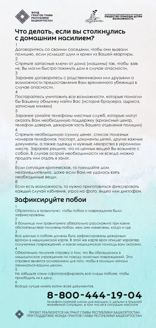 Как мы узнаем об абьюзе в семьях? Из рассказов подруг, признаний знаменитостей, которых в итоге часто начинают порицать в обществе, либо из криминальных хроник: убил, когда пыталась сбежать, избил за отказ в сексе. Женщины, страдающие от жестокого отношения в семье, нередко обращаются в полицию, но закон не всегда может им помочь. Чиновница Дина Махиянова, одна из жертв домашнего насилия, не раз писала заявления на бывшего мужа, говорила о его угрозах, но правоохранители бездействовали – и, в итоге, женщина была убита. Сотрудников полиции теперь судят за то, что они не предотвратили трагедию. В этом материале мы узнали у специалистов – юриста, психолога и директора кризисного центра – о том, какие есть действенные способы уйти от абьюзивного партнера.Как понять, что происходит абьюз? Как рассказала профессор кафедры психологического сопровождения и клинической психологии УУНиТ, клинический психолог РКПЦ Регина Халфина, иногда жертвы насилия сами не понимают, что происходит в их семье. Это связано и с тем, что у людей – разная норма терпимости. Например, более старшее поколение воспринимает порку детей как норму. На неправильную оценку ситуации в семье влияет и то, что абьюзер манипулирует, перекладывает ответственность за свои поступки на жертву. Типичная фраза агрессора: «Это ты меня довела своим поведением». Он может манипулировать своей жертвой, вызывая чувство вины. Например, муж не хочет общаться с родителями супруги, но говорит об этом не напрямую, а спрашивает: «Кого больше любишь: меня или родителей?» Если после этого жена пригласит родителей в гости, для абьюзера это будет означать, что супруга его не любит, а значит, можно применить к ней «штрафные санкции». Под влиянием манипуляций многие даже не понимают, как они согласились на что-то, чего не хотели. – Как распознать насилие? Задавать себе вопрос по поводу разных ситуаций: «А что я хочу?» Заниматься сексом или спать? Разговаривать сейчас с человеком или нет? Главный критерий насилия в широком смысле – это когда меня заставляют делать то, чего я не хочу. Например, неработающая жена будит мужа в три часа ночи после ссоры со словами: «Я не договорила». Он объясняет, что хочет спать, что ему завтра на работу. И это новая тема для ругани. Жена делает так, как хочет она, не принимая во внимание интересы партнера, – рассказала Халфина. В таких отношениях могут быть навязанные ценности. Например, супруга не должна перечить мужу. Но по факту это значит, что жена не может высказывать свои желания, мнение, отношение к чему-то. Могут быть разные виды насилия. С физическим и сексуальным более или менее понятно. Это когда с моим телом делают то, чего я не хочу. Бывает репродуктивное: муж заставляет пойти на аборт, когда жена хочет ребенка, или наоборот – рожать, когда женщина в плохом физическом состоянии. Существует финансовое насилие, когда, например, супруг контролирует все расходы, доходы, карточки. И его партнер не может распоряжаться своими деньгами, купить то, что хочет. Эмоциональное насилие – например, с помощью манипуляций. Когда человек находится в абьюзивных отношениях, у него возникают мысли: «Я же вроде бы стараюсь, все делаю, исполняю пожелания партнера, но в итоге все не так». Мнения жертвы и абьюзера сходятся в позиции «во всем виновата жертва», в том числе – в плохих отноше