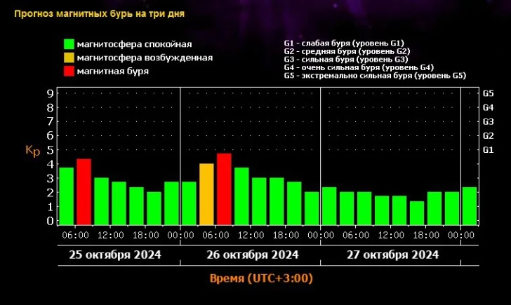 Возмущения магнитосферы Земли достигнут уровня магнитных бурь класса G1 после 6 утра по московскому времени в субботу 26 октября. Об этом предупредил ведущий специалист центра погоды «Фобос» Михаил Леус. Причиной бури станет мощная вспышка на Солнце в прошедший четверг, 24 октября. – После анализа всех поступивших данных, учёные пришли к выводу, что несмотря на то, что взрыв произошёл под очень большим углом к линии Солнце-Земля, близким к 90 градусам, он имеет компоненты, направленные к нашей планете, и это означает, что солнечное вещество распространяется в космос в секторе, близком и даже, вероятно, превышающем 180 градусов, – пояснил Михаил Леус. Часть облака солнечного вещества краем всё же заденет нашу планету в субботу утром. До этого, в середине ночи, геомагнитное поле станет слабо возмущенным, после 6 утра будет магнитная буря, которая закончится во второй половине дня. Возмущения геомагнитного поля будут постепенно ослабевать. Графика из соцсетей Михаила Леуса