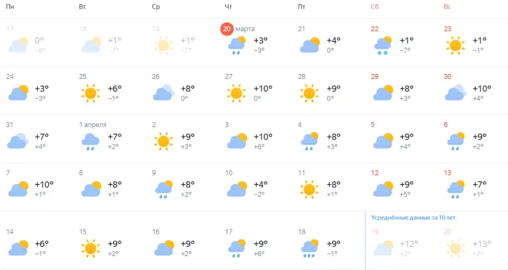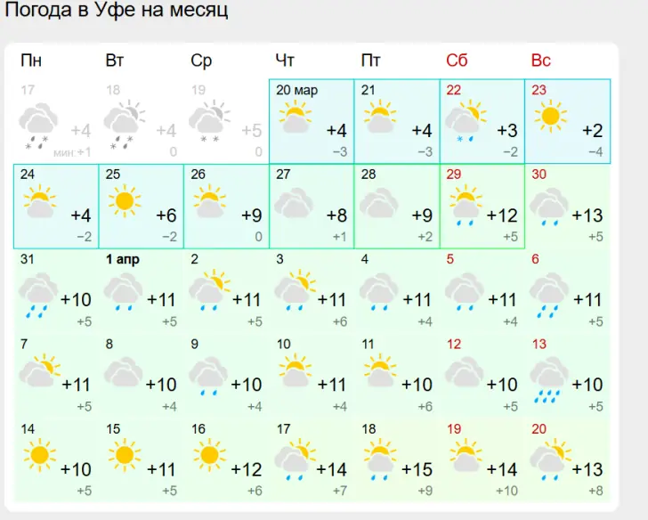 В Уфе можно будет увидеть +10° тепла уже на следующей неделе – это прогнозируют синоптики. По данным сервиса Яндекс.Погода, на текущей неделе температура воздуха будет примерно +1°, +4°, но уже со следующего вторника воздух начнет постепенно прогреваться. Правда, быстрого прихода теплой погоды ждать все же не стоит. Согласно Яндекс.погоде, в первую половину апреля ожидается температура воздуха примерно +8°, +10°, а также много дождливых дней. Скриншот: yandex.ru/pogoda На gismeteo.ru можно увидеть примерно такую же картину. По данным сервиса, +13° будет в воскресенье на следующей неделе – 30 марта, а +15° только 20 апреля. Скриншот: gismeteo.ru Также не стоит ожидать, что в апреле установится постоянная плюсовая температура. Так, по прогнозу Яндекс.погода, ночью 10 и 18 апреля возможно похолодание до -2°. Научный руководитель Гидрометцентра России Роман Вильфанд заявил ТАСС, что температурный фон на большей части европейской части России в апреле ожидается заметно выше нормы, в том числе это касается Приволжского федерального округа. На юге округа также ожидается количество осадков выше нормы. Последствия паводков Каждую весну Башкирия сталкивается с проблемой паводков, отрезающих деревни от дорог и затапливающих дома. Жители регулярно обращаются к властям, но сталкиваются с невыполненными обещаниями. Инженер по мониторингу водных объектов бассейнов рек Белой и Урала, кандидат географических наук Владимир Горячев рассказал, как возникают паводки и почему образуются пустоты. – Под нашим городом лежат известняковые породы, которые легко размываются водой, и под землёй образуются «пещеры», – объяснил Горячев. – Особенно это касается участков, которые засыпают строительном хламом. В естественных условиях почва уплотняется тысячелетиями, а то, чем иногда засыпают ямы на территории застройки, обладает совсем другой плотностью. Именно в этих местах вода от паводков и от ливней размывает почву интенсивнее, чем где-либо, и образуются пустоты.