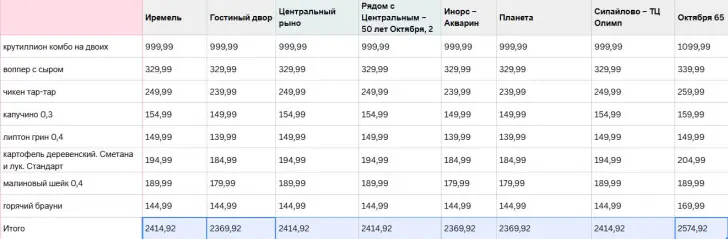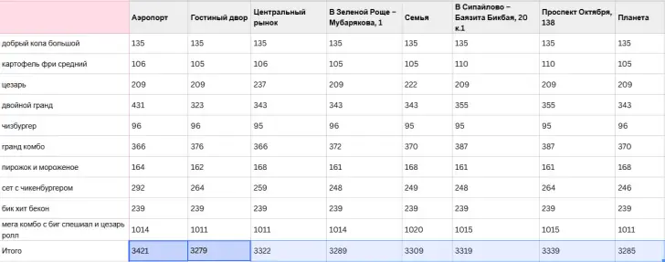 В этом нестабильном мире есть нечто постоянное – рестораны быстрого питания. Куда бы ни забросила тебя жизнь, кажется, там есть свой McDonald's (пусть и с другим названием) или Burger King, где ты можешь съесть знакомое блюдо. Очевидно, что стоимость одних и тех же товаров может разниться от города к городу. Но оказалось, что она порой отличается даже в двух соседних заведениях одного и того же ресторана. Здесь мы решили узнать, как меняется стоимость фастфуда в разных частях Уфы. Бывший McDonald's – «Вкусно – и точка» Если вы решили заказать через приложение «Вкусно – и точка» еду и случайно перепутали ресторан, то всю корзину придется пересобрать заново, потому что для каждого заведения здесь формируется отдельная корзина. И, вероятно, это не случайно, ведь цены от ресторана к ресторану на одни и те же блюда довольно заметно отличаются. И если бы корзина оставалась, пользователи бы заметили разницу. Для нашей статьи мы сравнили стоимость набора из 13 блюд в 8 ресторанах «Вкусно – и точка» Уфы. И хотя есть позиции, по которым цены не менялись (это большая кола, мороженое и бик хит бекон), все же большинство товаров разнились по стоимости. Например, чизбургер стоил то 95 рублей, то 96 рублей. Обычно разница была минимальной – 5-10 рублей. Однако можно было найти и более большой разрыв по стоимости. Например, салат Цезарь в большинстве заведений стоил 209 рублей, но в двух – 222 и 237. Самая дорогая корзина оказалась в ресторане аэропорта – 3421 рубль, что на 142 дороже, чем самая дешевая корзина. Однако нельзя сказать, что все блюда в ресторане аэропорта стоили дороже, чем в других «Вкусно – и точка» – только у некоторых товаров цена была завышена. Например, двойной гранд стоил в аэропорту на 108 рублей больше, чем самый дешевый его вариант. А сет с чикенбургером – на 46 рублей. Второй по дороговизне ресторан оказался на проспекте Октября – дом 138, самый дешевый – на Гостином дворе. Но стоит учитывать, что разница между этими корзинами оказалась не так велика – 60 рублей. И есть вероятность, что это была случайность – подбери мы другие блюда, возможно, рестораны бы поменялись местами в этом рейтинге. Burger King Взяли мы для сравнения и другое заведение общепита – Burger King. Здесь уже корзину не нужно пересобирать заново, меняя адреса ресторанов. Мы сравнили восемь заведений этой марки по восьми позициям. Стоимость оказалась более фиксированной. Часть корзин выходила по 2414,92 рубля, часть по – 2369,92. Во второй группе корзин четыре продукта были дешевле на 5-10 рублей: чикен тар-тар, капучино, липтон грин и картофель деревенский. Из схемы выбился Burger King по адресу проспект Октября, 65. Там заказ вышел дороже – 2574,92 рубля. Бывший KFC – Rostic’s Примерно такую же картину мы увидели и в Rostic’s. В приложении можно менять ресторан, не пересобирая корзину, а рестораны четко делятся по ценам на группы. Например, в ресторанах «Сипайлово», «Ниагара», «Семья», «Мега» 8 блюд стоят 2239 рублей, а в «Просторе» и «Гостином дворе» – 2199. Самая дорогая корзина была в черниковском «Меркурии» – 2293 рубля, что на 94 рубля больше самой дешевой. Вообще в Уфе довольно много Rostic’s, в нескольких районах данные рестораны стоят практически напротив друг друга. При этом цены в них могут отличаться. Так, возле ТЦ «Семья» находятся три Rostic’s – в двух из них цены одинаковые, а в третьем итоговая корзина дороже на 14 рублей. В Зеленой